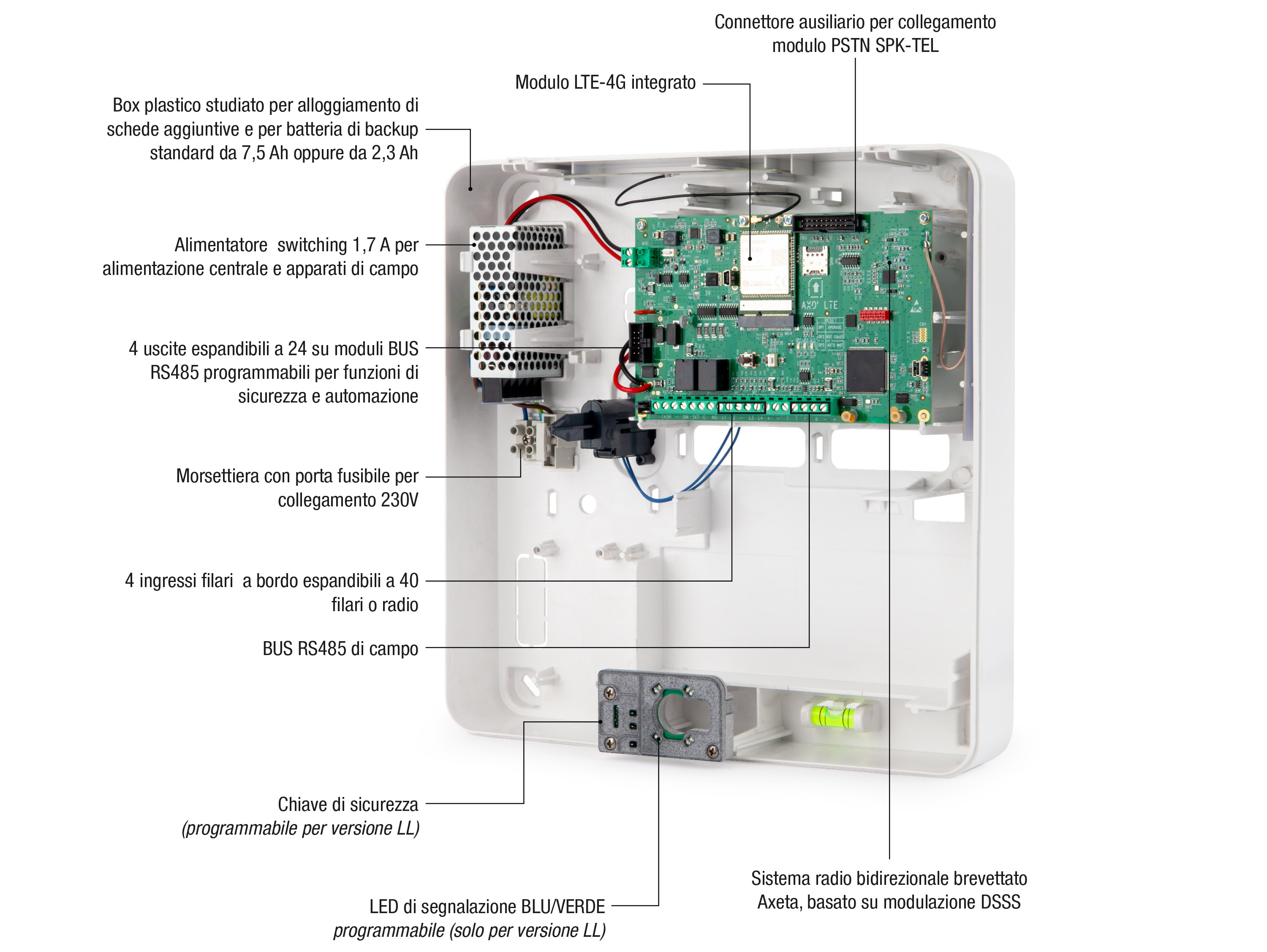Centrale ibrida con sistema radio Axeta integrato, studiata per soddisfare le esigenze di protezione specifiche di appartamenti, negozi e uffici.